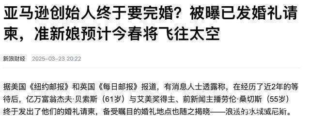 2023年啊,这两人又有大动作了。5月的时候,贝佐斯拿出了一颗价值250万美元的20克拉钻戒向桑切斯求婚。这钻戒可不得了啊,我就寻思这钻石的来源会不会有什么特别之处呢?是精心挑选的,还是有什么特殊的商业合作关系在里面?这求婚成功之后啊,8月他们就在意大利搞了个订婚派对。好家伙,这派对请的人可都是大牌,像碧昂丝和她丈夫Jay Z、伊万卡·特朗普、金·卡戴珊、肯达尔·詹娜、帕丽斯·希尔顿这些,全是娱乐圈和富豪圈的名人。这就像是一场超级豪华的聚会,把整个世界的目光都吸引过来了。